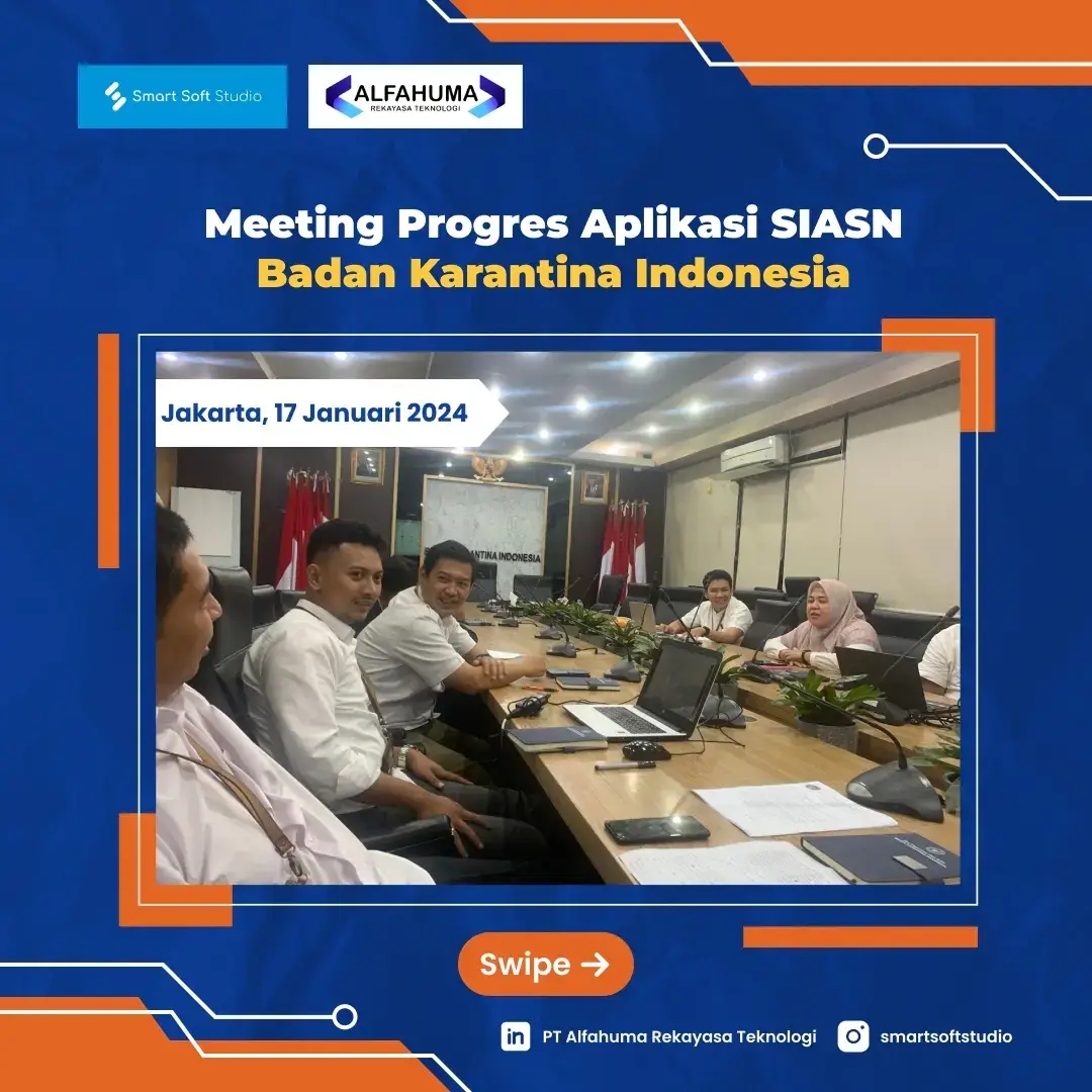 Jakarta, 17 Januari 2024. Perwakilan tim Alfahuma menghadiri Pertemuan di Gedung E Badan Karantina Indonesia. Saudara Arby Sudewa selaku Project Manager sedang melakukan meeting progress dengan Badan Karantina Indonesia terkait Aplikasi Sistem Informasi Aparatur Sipil Negara (SIASN) terintegrasi.